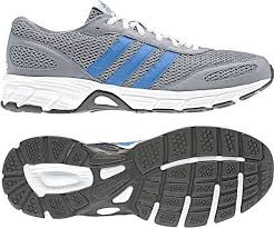 Pánska bežecká obuv značky Adidas. Sivej farby s modrými pásikmi a logom vzadu.