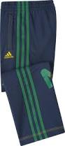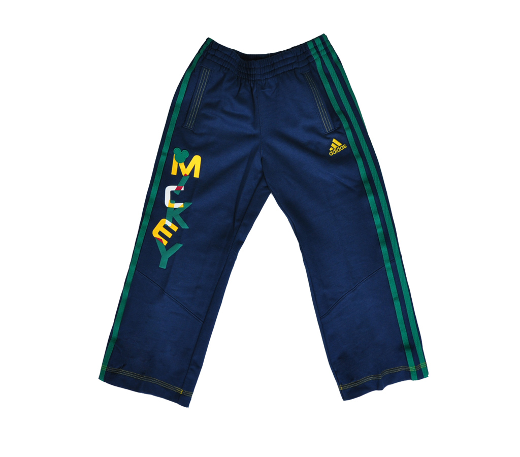 Chlapčenské tepláky zn. Adidas z kolekcie Disney modrej farby so zelenými pásikmi po bokoch. Na ľavej strane žlté logo Adidas, na pravej strane nápis MICKEY.
